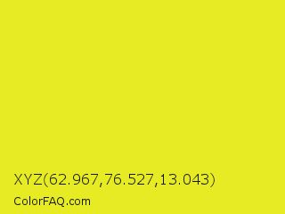 XYZ 62.967,76.527,13.043 Color is a normal yellow color and the nearest color is Piss Yellow #e1e115. Hex code #e7eb23 and RGB value is rgb(231,235,35). In RGB color space, this color is composed of 91% red, 92% green, 14% blue, In CMYK color space, this color is composed of 2% cyan, 0% magenta, 85% yellow , 8% black , In HSL color space, this color has a hue angle of 61° , 83% saturation and 53% lightness.