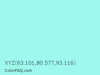 XYZ 63.101,80.577,93.116 Color is a light cyan color and the nearest color is Waterspout #a4f4f9. Hex code #9ef8ee and RGB value is rgb(158,248,238). In RGB color space, this color is composed of 62% red, 97% green, 93% blue, In CMYK color space, this color is composed of 36% cyan, 0% magenta, 4% yellow , 3% black , In HSL color space, this color has a hue angle of 173° , 87% saturation and 80% lightness.
