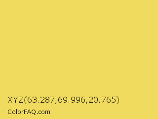 XYZ 63.287,69.996,20.765 Color is a light yellow color and the nearest color is Energy Yellow #f8dd5c. Hex code #f0db5e and RGB value is rgb(240,219,94). In RGB color space, this color is composed of 94% red, 86% green, 37% blue, In CMYK color space, this color is composed of 0% cyan, 9% magenta, 61% yellow , 6% black , In HSL color space, this color has a hue angle of 51° , 83% saturation and 65% lightness.