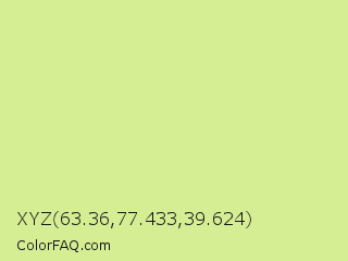 XYZ 63.36,77.433,39.624 Color is a light lime color and the nearest color is Deco #d2da97. Hex code #d5ee94 and RGB value is rgb(213,238,148). In RGB color space, this color is composed of 84% red, 93% green, 58% blue, In CMYK color space, this color is composed of 11% cyan, 0% magenta, 38% yellow , 7% black , In HSL color space, this color has a hue angle of 77° , 73% saturation and 76% lightness.