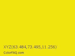 XYZ 63.484,73.495,11.256 Color is a normal yellow color and the nearest color is Titanium Yellow #eee600. Hex code #f0e30e and RGB value is rgb(240,227,14). In RGB color space, this color is composed of 94% red, 89% green, 5% blue, In CMYK color space, this color is composed of 0% cyan, 5% magenta, 94% yellow , 6% black , In HSL color space, this color has a hue angle of 57° , 89% saturation and 50% lightness.