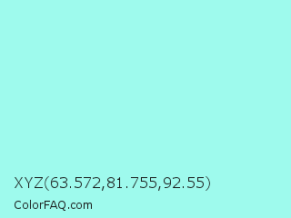 XYZ 63.572,81.755,92.55 Color is a light cyan color and the nearest color is Waterspout #a4f4f9. Hex code #9efaed and RGB value is rgb(158,250,237). In RGB color space, this color is composed of 62% red, 98% green, 93% blue, In CMYK color space, this color is composed of 37% cyan, 0% magenta, 5% yellow , 2% black , In HSL color space, this color has a hue angle of 172° , 90% saturation and 80% lightness.