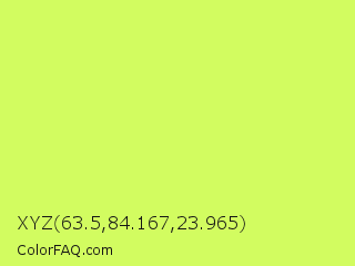 XYZ 63.5,84.167,23.965 Color is a light lime color and the nearest color is Maximum Green Yellow #d9e650. Hex code #d2fc60 and RGB value is rgb(210,252,96). In RGB color space, this color is composed of 82% red, 99% green, 38% blue, In CMYK color space, this color is composed of 17% cyan, 0% magenta, 62% yellow , 1% black , In HSL color space, this color has a hue angle of 76° , 96% saturation and 68% lightness.