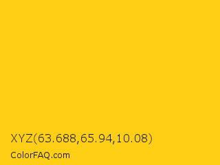 XYZ 63.688,65.94,10.08 Color is a normal yellow color and the nearest color is Candlelight #fcd917. Hex code #ffcf15 and RGB value is rgb(255,207,21). In RGB color space, this color is composed of 100% red, 81% green, 8% blue, In CMYK color space, this color is composed of 0% cyan, 19% magenta, 92% yellow , 0% black , In HSL color space, this color has a hue angle of 48° , 100% saturation and 54% lightness.