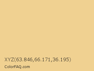 XYZ 63.846,66.171,36.195 Color is a light orange color and the nearest color is Chalky #eed794. Hex code #f0d191 and RGB value is rgb(240,209,145). In RGB color space, this color is composed of 94% red, 82% green, 57% blue, In CMYK color space, this color is composed of 0% cyan, 13% magenta, 40% yellow , 6% black , In HSL color space, this color has a hue angle of 40° , 76% saturation and 75% lightness.