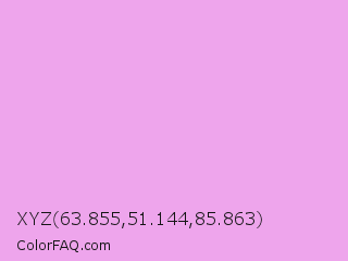 XYZ 63.855,51.144,85.863 Color is a light magenta color and the nearest color is Lavender Rose #fba0e3. Hex code #eea5ec and RGB value is rgb(238,165,236). In RGB color space, this color is composed of 93% red, 65% green, 93% blue, In CMYK color space, this color is composed of 0% cyan, 31% magenta, 1% yellow , 7% black , In HSL color space, this color has a hue angle of 302° , 68% saturation and 79% lightness.