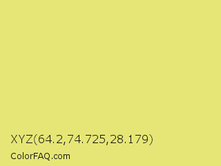 XYZ 64.2,74.725,28.179 Color is a light yellow color and the nearest color is Manz #eeef78. Hex code #e6e676 and RGB value is rgb(230,230,118). In RGB color space, this color is composed of 90% red, 90% green, 46% blue, In CMYK color space, this color is composed of 0% cyan, 0% magenta, 49% yellow , 10% black , In HSL color space, this color has a hue angle of 60° , 69% saturation and 68% lightness.