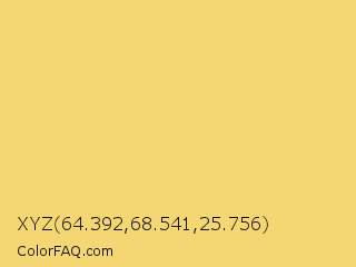 XYZ 64.392,68.541,25.756 Color is a light yellow color and the nearest color is Orange Yellow #f8d568. Hex code #f4d672 and RGB value is rgb(244,214,114). In RGB color space, this color is composed of 96% red, 84% green, 45% blue, In CMYK color space, this color is composed of 0% cyan, 12% magenta, 53% yellow , 4% black , In HSL color space, this color has a hue angle of 46° , 86% saturation and 70% lightness.