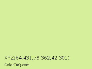 XYZ 64.431,78.362,42.301 Color is a light lime color and the nearest color is Deco #d2da97. Hex code #d6ef9a and RGB value is rgb(214,239,154). In RGB color space, this color is composed of 84% red, 94% green, 60% blue, In CMYK color space, this color is composed of 10% cyan, 0% magenta, 36% yellow , 6% black , In HSL color space, this color has a hue angle of 78° , 73% saturation and 77% lightness.
