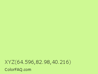 XYZ 64.596,82.98,40.216 Color is a light green color and the nearest color is Reef #c9ffa2. Hex code #cef993 and RGB value is rgb(206,249,147). In RGB color space, this color is composed of 81% red, 98% green, 58% blue, In CMYK color space, this color is composed of 17% cyan, 0% magenta, 41% yellow , 2% black , In HSL color space, this color has a hue angle of 85° , 89% saturation and 78% lightness.
