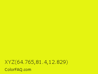 XYZ 64.765,81.4,12.829 Color is a normal yellow color and the nearest color is Piss Yellow #e1e115. Hex code #e5f411 and RGB value is rgb(229,244,17). In RGB color space, this color is composed of 90% red, 96% green, 7% blue, In CMYK color space, this color is composed of 6% cyan, 0% magenta, 93% yellow , 4% black , In HSL color space, this color has a hue angle of 64° , 91% saturation and 51% lightness.