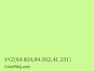 XYZ 64.824,84.002,41.231 Color is a light green color and the nearest color is Reef #c9ffa2. Hex code #ccfb95 and RGB value is rgb(204,251,149). In RGB color space, this color is composed of 80% red, 98% green, 58% blue, In CMYK color space, this color is composed of 19% cyan, 0% magenta, 41% yellow , 2% black , In HSL color space, this color has a hue angle of 88° , 93% saturation and 78% lightness.