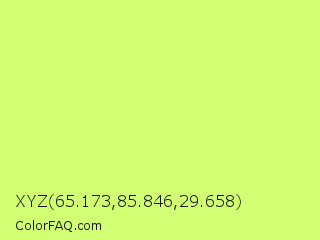 XYZ 65.173,85.846,29.658 Color is a light lime color and the nearest color is Sulu #c1f07c. Hex code #d2fe74 and RGB value is rgb(210,254,116). In RGB color space, this color is composed of 82% red, 100% green, 45% blue, In CMYK color space, this color is composed of 17% cyan, 0% magenta, 54% yellow , 0% black , In HSL color space, this color has a hue angle of 79° , 99% saturation and 73% lightness.