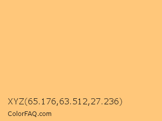 XYZ 65.176,63.512,27.236 Color is a light orange color and the nearest color is Topaz #ffc87c. Hex code #ffc77a and RGB value is rgb(255,199,122). In RGB color space, this color is composed of 100% red, 78% green, 48% blue, In CMYK color space, this color is composed of 0% cyan, 22% magenta, 52% yellow , 0% black , In HSL color space, this color has a hue angle of 35° , 100% saturation and 74% lightness.