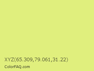 XYZ 65.309,79.061,31.22 Color is a light yellow color and the nearest color is Manz #eeef78. Hex code #e0ef7d and RGB value is rgb(224,239,125). In RGB color space, this color is composed of 88% red, 94% green, 49% blue, In CMYK color space, this color is composed of 6% cyan, 0% magenta, 48% yellow , 6% black , In HSL color space, this color has a hue angle of 68° , 78% saturation and 71% lightness.