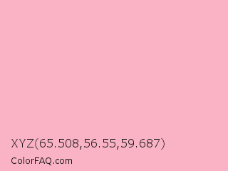 XYZ 65.508,56.55,59.687 Color is a very light red color and the nearest color is Cherry Blossom Pink #ffb7c5. Hex code #fab3c4 and RGB value is rgb(250,179,196). In RGB color space, this color is composed of 98% red, 70% green, 77% blue, In CMYK color space, this color is composed of 0% cyan, 28% magenta, 22% yellow , 2% black , In HSL color space, this color has a hue angle of 346° , 88% saturation and 84% lightness.