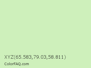 XYZ 65.583,79.03,58.811 Color is a very light green color and the nearest color is Tea Green #d0f0c0. Hex code #cef0bb and RGB value is rgb(206,240,187). In RGB color space, this color is composed of 81% red, 94% green, 73% blue, In CMYK color space, this color is composed of 14% cyan, 0% magenta, 22% yellow , 6% black , In HSL color space, this color has a hue angle of 98° , 64% saturation and 84% lightness.