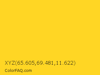 XYZ 65.605,69.481,11.622 Color is a normal yellow color and the nearest color is Candlelight #fcd917. Hex code #ffd624 and RGB value is rgb(255,214,36). In RGB color space, this color is composed of 100% red, 84% green, 14% blue, In CMYK color space, this color is composed of 0% cyan, 16% magenta, 86% yellow , 0% black , In HSL color space, this color has a hue angle of 49° , 100% saturation and 57% lightness.