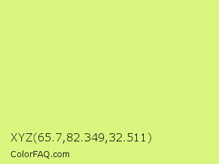 XYZ 65.7,82.349,32.511 Color is a light lime color and the nearest color is Mindaro #e3f988. Hex code #daf67f and RGB value is rgb(218,246,127). In RGB color space, this color is composed of 85% red, 96% green, 50% blue, In CMYK color space, this color is composed of 11% cyan, 0% magenta, 48% yellow , 4% black , In HSL color space, this color has a hue angle of 74° , 87% saturation and 73% lightness.