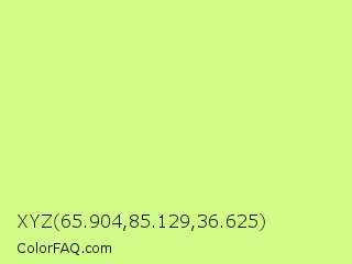 XYZ 65.904,85.129,36.625 Color is a light green color and the nearest color is Mindaro #e3f988. Hex code #d2fc89 and RGB value is rgb(210,252,137). In RGB color space, this color is composed of 82% red, 99% green, 54% blue, In CMYK color space, this color is composed of 17% cyan, 0% magenta, 46% yellow , 1% black , In HSL color space, this color has a hue angle of 82° , 95% saturation and 76% lightness.
