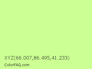 XYZ 66.007,86.495,41.233 Color is a light green color and the nearest color is Reef #c9ffa2. Hex code #ccff94 and RGB value is rgb(204,255,148). In RGB color space, this color is composed of 80% red, 100% green, 58% blue, In CMYK color space, this color is composed of 20% cyan, 0% magenta, 42% yellow , 0% black , In HSL color space, this color has a hue angle of 89° , 100% saturation and 79% lightness.