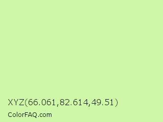 XYZ 66.061,82.614,49.51 Color is a very light green color and the nearest color is Gossip #d2f8b0. Hex code #cff7a8 and RGB value is rgb(207,247,168). In RGB color space, this color is composed of 81% red, 97% green, 66% blue, In CMYK color space, this color is composed of 16% cyan, 0% magenta, 32% yellow , 3% black , In HSL color space, this color has a hue angle of 90° , 83% saturation and 81% lightness.