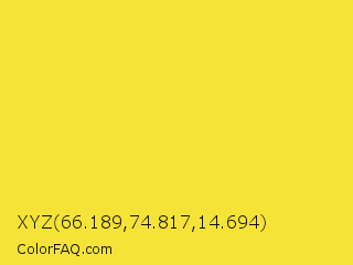 XYZ 66.189,74.817,14.694 Color is a normal yellow color and the nearest color is Banana Yellow #ffe135. Hex code #f6e338 and RGB value is rgb(246,227,56). In RGB color space, this color is composed of 96% red, 89% green, 22% blue, In CMYK color space, this color is composed of 0% cyan, 8% magenta, 77% yellow , 4% black , In HSL color space, this color has a hue angle of 54° , 91% saturation and 59% lightness.