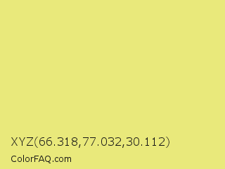 XYZ 66.318,77.032,30.112 Color is a light yellow color and the nearest color is Manz #eeef78. Hex code #e9e97b and RGB value is rgb(233,233,123). In RGB color space, this color is composed of 91% red, 91% green, 48% blue, In CMYK color space, this color is composed of 0% cyan, 0% magenta, 47% yellow , 9% black , In HSL color space, this color has a hue angle of 60° , 71% saturation and 70% lightness.