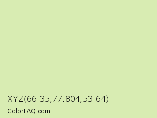 XYZ 66.35,77.804,53.64 Color is a very light green color and the nearest color is Caper #dcedb4. Hex code #d8ecb2 and RGB value is rgb(216,236,178). In RGB color space, this color is composed of 85% red, 93% green, 70% blue, In CMYK color space, this color is composed of 8% cyan, 0% magenta, 25% yellow , 7% black , In HSL color space, this color has a hue angle of 81° , 60% saturation and 81% lightness.