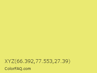 XYZ 66.392,77.553,27.39 Color is a light yellow color and the nearest color is Manz #eeef78. Hex code #eaea72 and RGB value is rgb(234,234,114). In RGB color space, this color is composed of 92% red, 92% green, 45% blue, In CMYK color space, this color is composed of 0% cyan, 0% magenta, 51% yellow , 8% black , In HSL color space, this color has a hue angle of 60° , 74% saturation and 68% lightness.