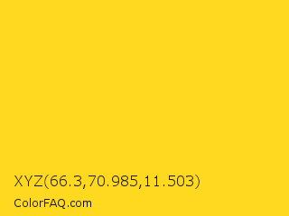 XYZ 66.3,70.985,11.503 Color is a normal yellow color and the nearest color is Candlelight #fcd917. Hex code #ffd91f and RGB value is rgb(255,217,31). In RGB color space, this color is composed of 100% red, 85% green, 12% blue, In CMYK color space, this color is composed of 0% cyan, 15% magenta, 88% yellow , 0% black , In HSL color space, this color has a hue angle of 50° , 100% saturation and 56% lightness.