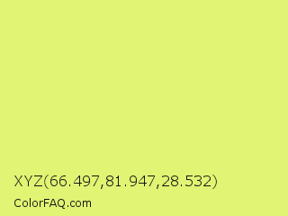 XYZ 66.497,81.947,28.532 Color is a light yellow color and the nearest color is Manz #eeef78. Hex code #e1f473 and RGB value is rgb(225,244,115). In RGB color space, this color is composed of 88% red, 96% green, 45% blue, In CMYK color space, this color is composed of 8% cyan, 0% magenta, 53% yellow , 4% black , In HSL color space, this color has a hue angle of 69° , 85% saturation and 70% lightness.