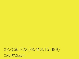 XYZ 66.722,78.413,15.489 Color is a normal yellow color and the nearest color is Dandelion #f0e130. Hex code #f1eb39 and RGB value is rgb(241,235,57). In RGB color space, this color is composed of 95% red, 92% green, 22% blue, In CMYK color space, this color is composed of 0% cyan, 2% magenta, 76% yellow , 5% black , In HSL color space, this color has a hue angle of 58° , 87% saturation and 58% lightness.