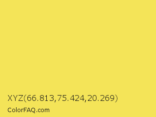 XYZ 66.813,75.424,20.269 Color is a light yellow color and the nearest color is Energy Yellow #f8dd5c. Hex code #f4e458 and RGB value is rgb(244,228,88). In RGB color space, this color is composed of 96% red, 89% green, 35% blue, In CMYK color space, this color is composed of 0% cyan, 7% magenta, 64% yellow , 4% black , In HSL color space, this color has a hue angle of 54° , 88% saturation and 65% lightness.