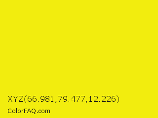 XYZ 66.981,79.477,12.226 Color is a normal yellow color and the nearest color is Lemon #fde910. Hex code #f2ed0e and RGB value is rgb(242,237,14). In RGB color space, this color is composed of 95% red, 93% green, 5% blue, In CMYK color space, this color is composed of 0% cyan, 2% magenta, 94% yellow , 5% black , In HSL color space, this color has a hue angle of 59° , 90% saturation and 50% lightness.