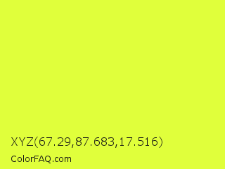 XYZ 67.29,87.683,17.516 Color is a light yellow color and the nearest color is Starship #ecf245. Hex code #e0ff3b and RGB value is rgb(224,255,59). In RGB color space, this color is composed of 88% red, 100% green, 23% blue, In CMYK color space, this color is composed of 12% cyan, 0% magenta, 77% yellow , 0% black , In HSL color space, this color has a hue angle of 69° , 100% saturation and 62% lightness.
