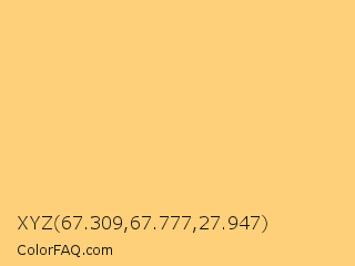 XYZ 67.309,67.777,27.947 Color is a light orange color and the nearest color is Topaz #ffc87c. Hex code #ffd07a and RGB value is rgb(255,208,122). In RGB color space, this color is composed of 100% red, 82% green, 48% blue, In CMYK color space, this color is composed of 0% cyan, 18% magenta, 52% yellow , 0% black , In HSL color space, this color has a hue angle of 39° , 100% saturation and 74% lightness.
