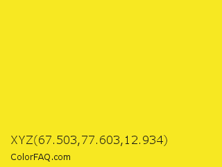 XYZ 67.503,77.603,12.934 Color is a normal yellow color and the nearest color is Dandelion #f0e130. Hex code #f7e822 and RGB value is rgb(247,232,34). In RGB color space, this color is composed of 97% red, 91% green, 13% blue, In CMYK color space, this color is composed of 0% cyan, 6% magenta, 86% yellow , 3% black , In HSL color space, this color has a hue angle of 56° , 93% saturation and 55% lightness.