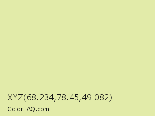 XYZ 68.234,78.45,49.082 Color is a light yellow color and the nearest color is Pale Goldenrod #eee8aa. Hex code #e2eba9 and RGB value is rgb(226,235,169). In RGB color space, this color is composed of 89% red, 92% green, 66% blue, In CMYK color space, this color is composed of 4% cyan, 0% magenta, 28% yellow , 8% black , In HSL color space, this color has a hue angle of 68° , 62% saturation and 79% lightness.
