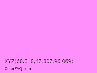 XYZ 68.318,47.807,96.069 Color is a light magenta color and the nearest color is Light Fuchsia Pink #f984ef. Hex code #ff8ffa and RGB value is rgb(255,143,250). In RGB color space, this color is composed of 100% red, 56% green, 98% blue, In CMYK color space, this color is composed of 0% cyan, 44% magenta, 2% yellow , 0% black , In HSL color space, this color has a hue angle of 303° , 100% saturation and 78% lightness.