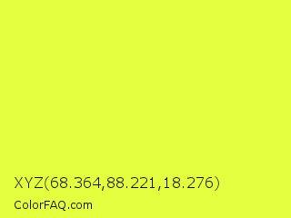 XYZ 68.364,88.221,18.276 Color is a light yellow color and the nearest color is Starship #ecf245. Hex code #e3ff40 and RGB value is rgb(227,255,64). In RGB color space, this color is composed of 89% red, 100% green, 25% blue, In CMYK color space, this color is composed of 11% cyan, 0% magenta, 75% yellow , 0% black , In HSL color space, this color has a hue angle of 69° , 100% saturation and 63% lightness.