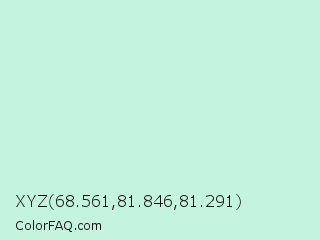 XYZ 68.561,81.846,81.291 Color is a very light green color and the nearest color is Mint Tulip #c4f4eb. Hex code #c5f4de and RGB value is rgb(197,244,222). In RGB color space, this color is composed of 77% red, 96% green, 87% blue, In CMYK color space, this color is composed of 19% cyan, 0% magenta, 9% yellow , 4% black , In HSL color space, this color has a hue angle of 152° , 68% saturation and 86% lightness.