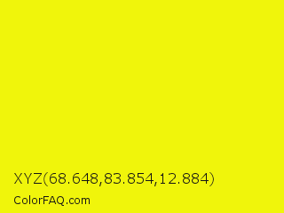 XYZ 68.648,83.854,12.884 Color is a normal yellow color and the nearest color is Lemon #fde910. Hex code #f0f50b and RGB value is rgb(240,245,11). In RGB color space, this color is composed of 94% red, 96% green, 4% blue, In CMYK color space, this color is composed of 2% cyan, 0% magenta, 96% yellow , 4% black , In HSL color space, this color has a hue angle of 61° , 92% saturation and 50% lightness.