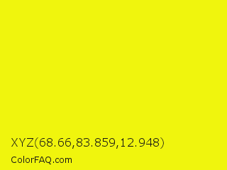 XYZ 68.66,83.859,12.948 Color is a normal yellow color and the nearest color is Lemon #fde910. Hex code #f0f50d and RGB value is rgb(240,245,13). In RGB color space, this color is composed of 94% red, 96% green, 5% blue, In CMYK color space, this color is composed of 2% cyan, 0% magenta, 95% yellow , 4% black , In HSL color space, this color has a hue angle of 61° , 92% saturation and 51% lightness.