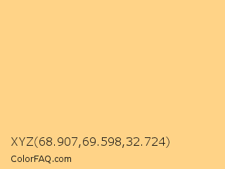 XYZ 68.907,69.598,32.724 Color is a light orange color and the nearest color is Grandis #ffd38c. Hex code #ffd387 and RGB value is rgb(255,211,135). In RGB color space, this color is composed of 100% red, 83% green, 53% blue, In CMYK color space, this color is composed of 0% cyan, 17% magenta, 47% yellow , 0% black , In HSL color space, this color has a hue angle of 38° , 100% saturation and 76% lightness.