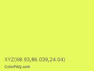 XYZ 68.93,86.039,24.04 Color is a light yellow color and the nearest color is Canary #f3fb62. Hex code #e6fa60 and RGB value is rgb(230,250,96). In RGB color space, this color is composed of 90% red, 98% green, 38% blue, In CMYK color space, this color is composed of 8% cyan, 0% magenta, 62% yellow , 2% black , In HSL color space, this color has a hue angle of 68° , 94% saturation and 68% lightness.