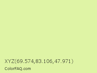 XYZ 69.574,83.106,47.971 Color is a light lime color and the nearest color is Caper #dcedb4. Hex code #dff4a5 and RGB value is rgb(223,244,165). In RGB color space, this color is composed of 87% red, 96% green, 65% blue, In CMYK color space, this color is composed of 9% cyan, 0% magenta, 32% yellow , 4% black , In HSL color space, this color has a hue angle of 76° , 78% saturation and 80% lightness.