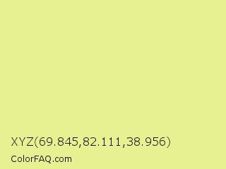XYZ 69.845,82.111,38.956 Color is a light yellow color and the nearest color is Key Lime #e8f48c. Hex code #e8f191 and RGB value is rgb(232,241,145). In RGB color space, this color is composed of 91% red, 95% green, 57% blue, In CMYK color space, this color is composed of 4% cyan, 0% magenta, 40% yellow , 5% black , In HSL color space, this color has a hue angle of 66° , 77% saturation and 76% lightness.