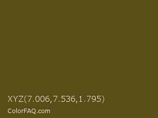 XYZ 7.006,7.536,1.795 Color is a very dark yellow color and the nearest color is Horses Neck #604913. Hex code #5a4d15 and RGB value is rgb(90,77,21). In RGB color space, this color is composed of 35% red, 30% green, 8% blue, In CMYK color space, this color is composed of 0% cyan, 14% magenta, 77% yellow , 65% black , In HSL color space, this color has a hue angle of 49° , 62% saturation and 22% lightness.