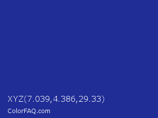 XYZ 7.039,4.386,29.33 Color is a normal blue color and the nearest color is Jacksons Purple #20208d. Hex code #202d96 and RGB value is rgb(32,45,150). In RGB color space, this color is composed of 13% red, 18% green, 59% blue, In CMYK color space, this color is composed of 79% cyan, 70% magenta, 0% yellow , 41% black , In HSL color space, this color has a hue angle of 233° , 65% saturation and 36% lightness.